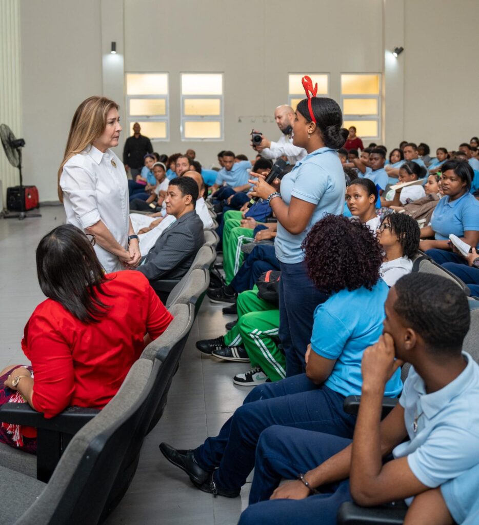 Santo Domingo, DN- Carolina Mejía, al sostener una conversación con los estudiantes del Instituto de Señoritas Salomé Ureña, mediante el programa La Alcaldía Llega a los Centros Educativos, destacó la importancia de la recuperación de los espacios públicos y, con ello, el cuidado del medio ambiente.
