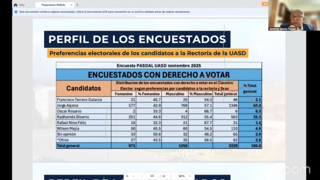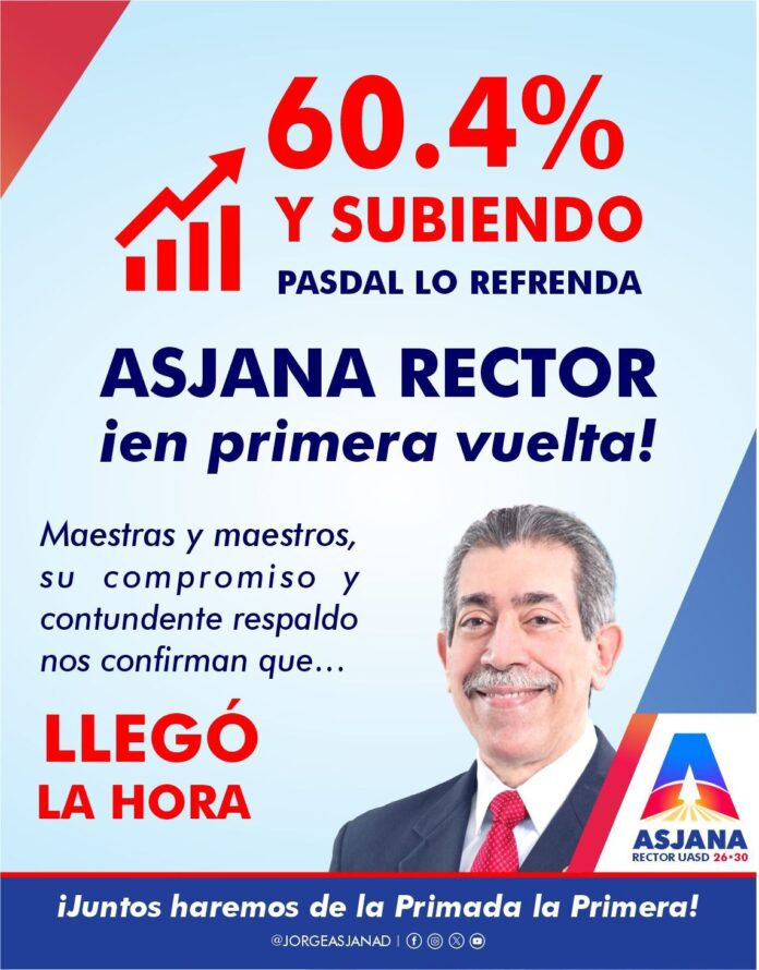 Santo Domingo, R.D. – La más reciente Encuesta PASDAL-UASD noviembre 2025 revela un notable ascenso en la preferencia electoral del candidato a la Rectoría de la Universidad Autónoma de Santo Domingo (UASD), Jorge Asjana, quien se posiciona en un nivel superior con respecto al estudio anterior, consolidando así su fortaleza dentro del electorado universitario con derecho a voto.