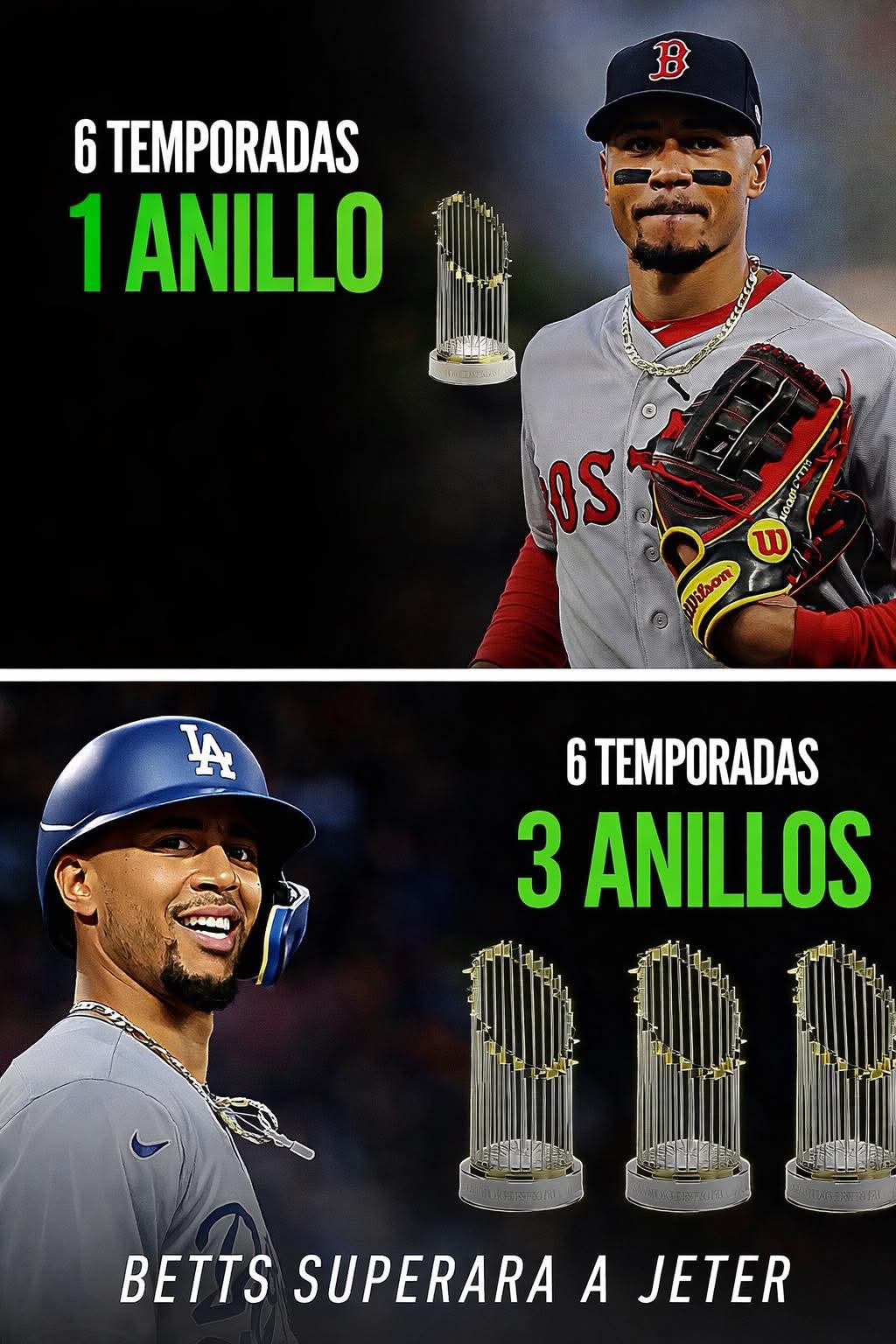 En el béisbol, como en la vida, el cambio importa. En sus primeras 6 temporadas, Mookie Betts ganó un anillo con Boston en 2018, siendo una superestrella indiscutible. Luego vino el cambio… y en el mismo período de tiempo ya suma 3 anillos de Serie Mundial. El talento siempre estuvo ahí, pero el entorno, el momento y las decisiones correctas terminan marcando la diferencia. No siempre es cuestión de jugar mejor, sino de estar en el lugar correcto. 🏆✨ #GrandesLigas #beisbol #baseball #MLB