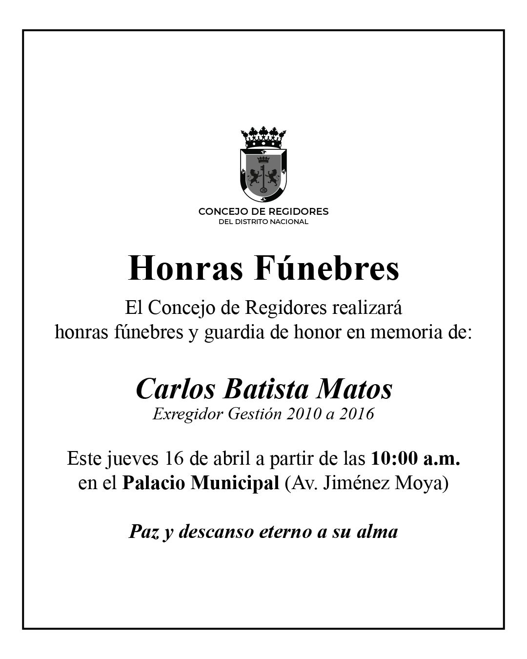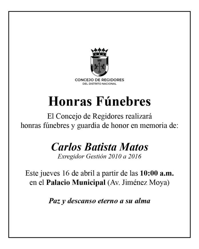 Santo Domingo, DN – La Alcaldía del Distrito Nacional y el Concejo de Regidores rendirán honras fúnebres al comunicador Carlos Batista Matos, quien se desempeñó como regidor en esta demarcación en el periodo 2010-2016.