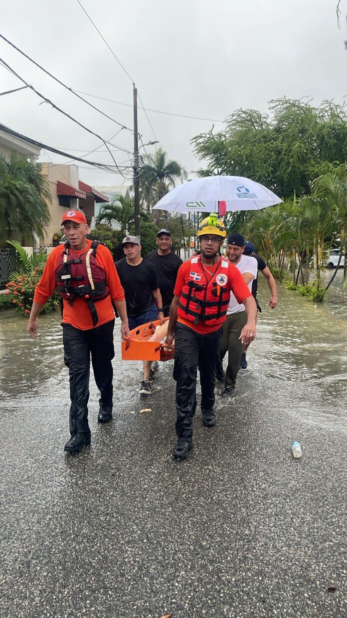 Mientras que, técnicos de la Defensa Civil rescataron con vida a un señor que quedó atrapado en una alcantarilla del sector Las Praderas en Santo Domingo Oeste, donde también llevaron a diez adultos mayores a una zona segura tras las inundaciones.