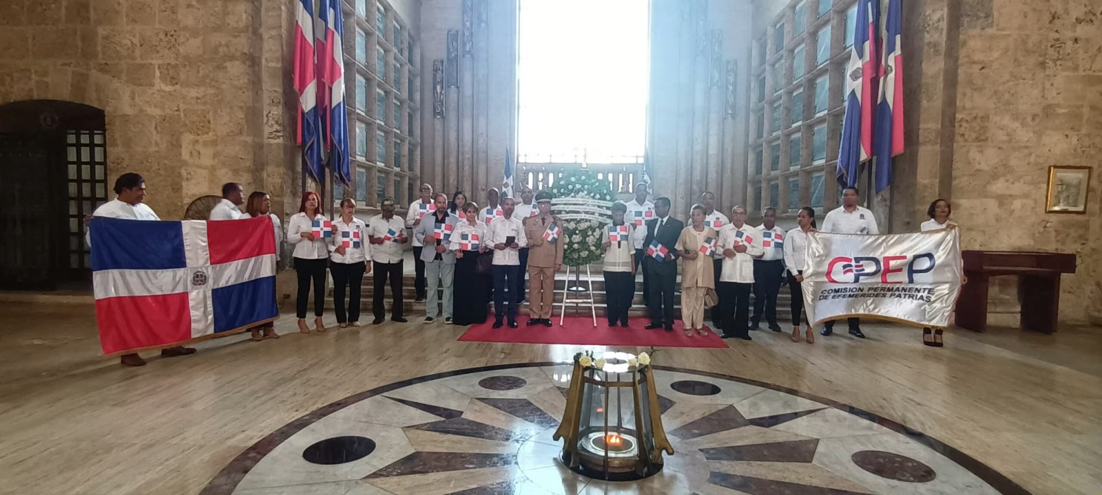 La ceremonia inició a las nueve de la mañana en el Panteón de la Patria, con la caminata marcial de la Guardia de Honor y la comisión de homenaje al compás ceremonial, hasta llegar al altar sagrado del panteón, a seguidas se depositó una ofrenda floral con el rigor militar, para dar paso al ritual ante la llama votiva, símbolo de la perpetuidad de la patria, luego se entonaron las notas del Himno Nacional en medio de un silencio conmovedor.