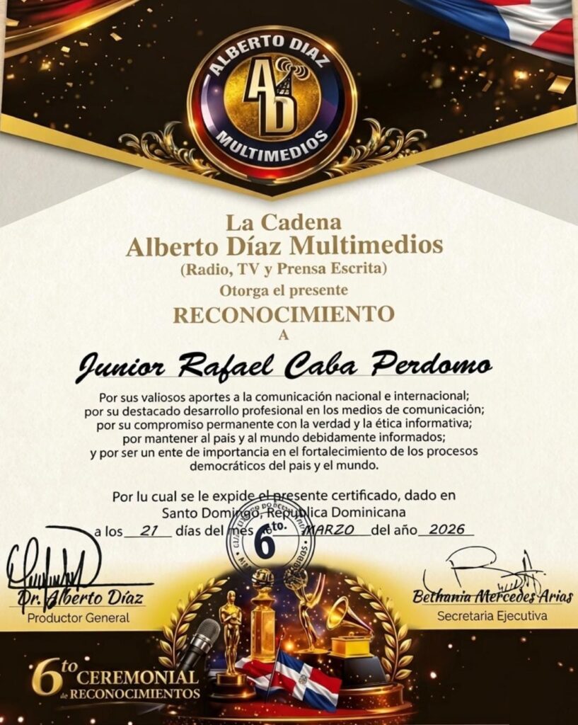 Santo Domingo, DN, 21 de marzo de 2026. En el marco de la 6ta. Ceremonial de Reconocimientos, la Cadena Alberto Díaz Multimedios otorgó una distinción especial al comunicador Junior Caba Perdomo, CEO del programa y periódico digital Socializandoinforma.com y Socializando con Junior Caba RD.
