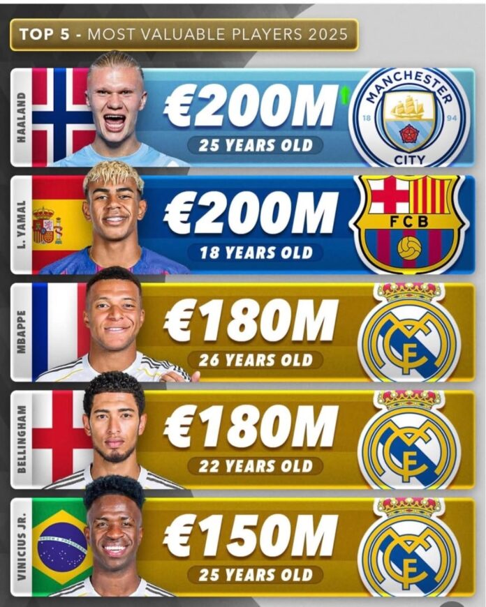 DeportesFútbol El ranking con los futbolistas con mayor valor de mercado en la actualidad. By Socializandoinforma.com - Dom 14/12/2025 0 Facebook WhatsApp Email Print Telegram Erling Haaland y Lamine Yamal lideran la lista con un valor de 200 millones de euros. Mbappé, Bellingham y Vinicius completan el top 5. Los futbolistas que están destinados a dominar el fútbol.