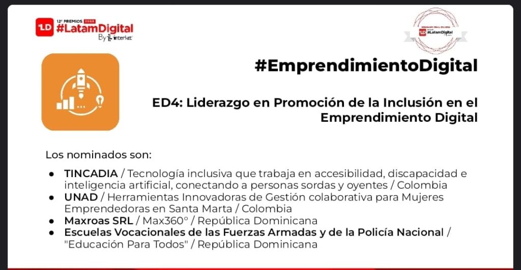 Santo Domingo, 6 de mayo de 2025. — La Dirección General de las Escuelas Vocacionales de las Fuerzas Armadas y de la Policía Nacional (DIGEV) del Ministerio de Defensa (MIDE) ha sido distinguida como nominada finalista en dos categorías de los 12vos. Premios Latam Digital 2025: “Mejor Estrategia de Transformación Digital en Instituciones Educativa” y “Mejor Programa de Inclusión Educativa Digital” dentro del Pilar Edutech.