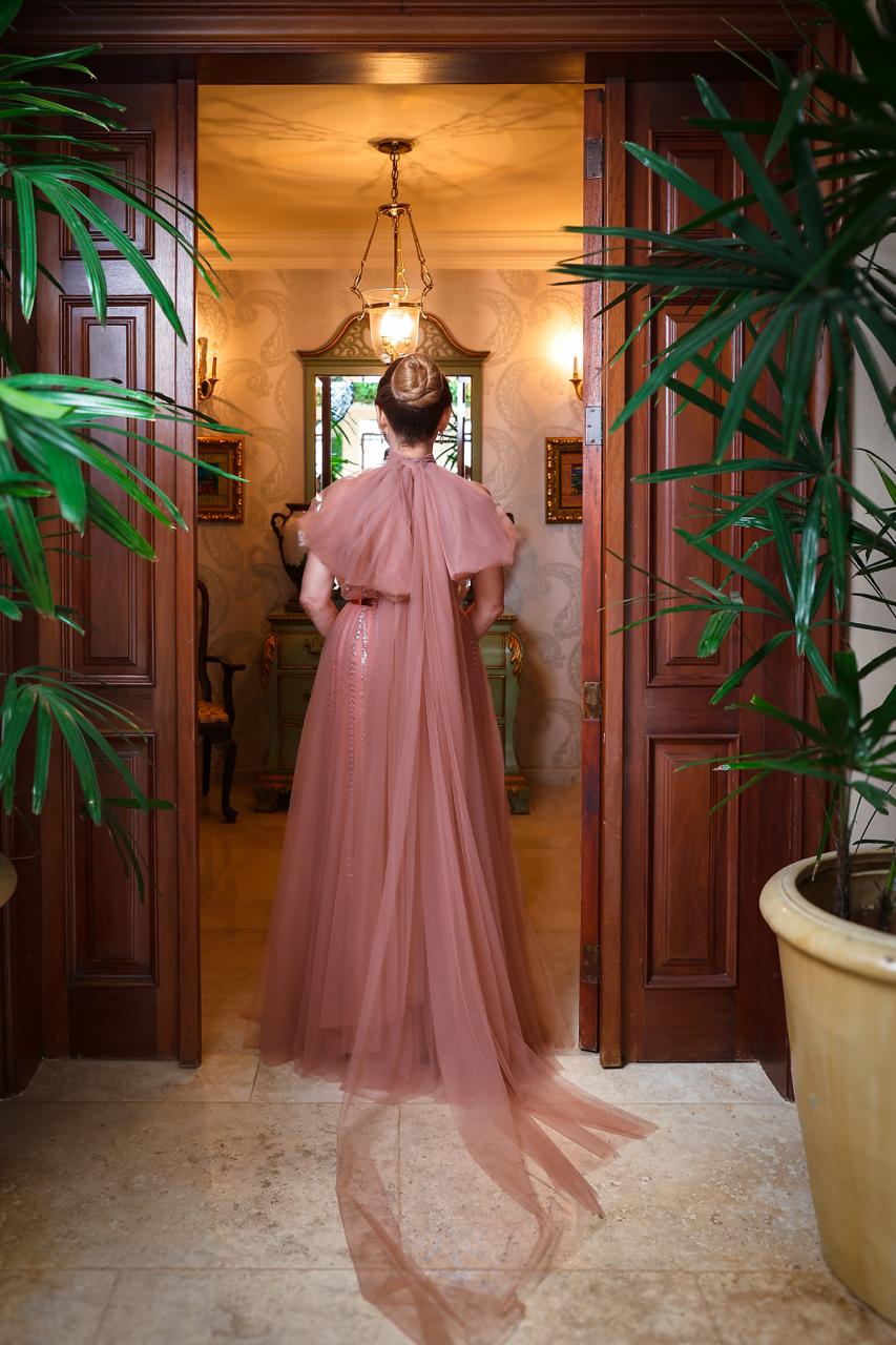 Sobre esta base se creó un sobrecapa en fino tul de seda de tono bronce blush, de silueta halter fruncida a cinturilla de metal bronce rosa y falda sesgada y fruncida. Terminado en cuello alto fruncido, finalizando en gran lazada trasera de largas patas asimétricas.