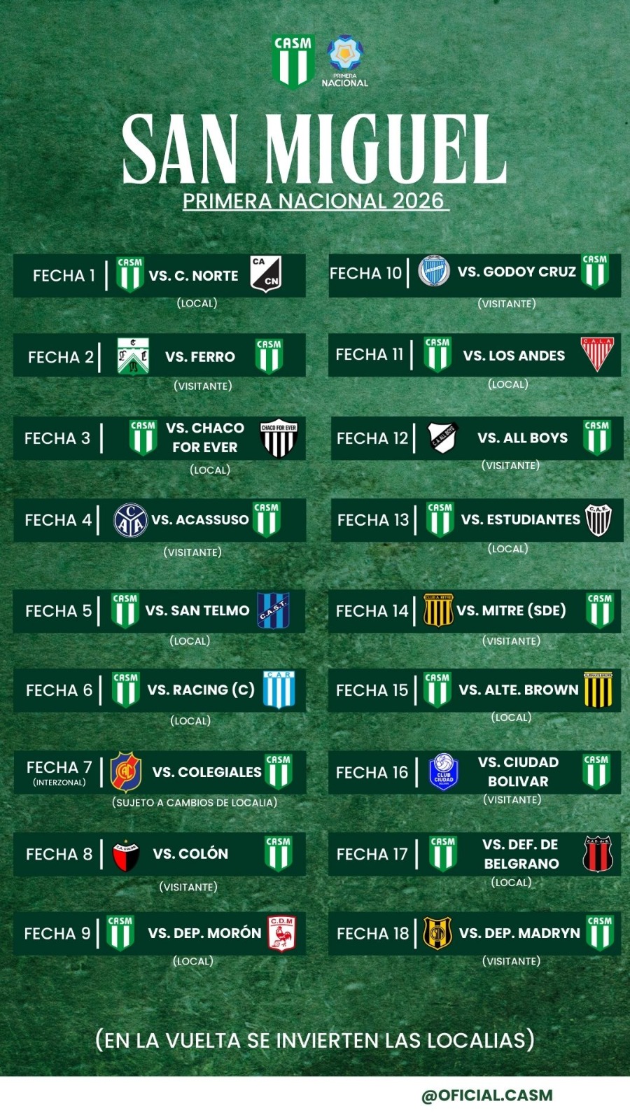 San Miguel ya tiene fixture confirmado de cara al campeonato de la Primera Nacional 2026.