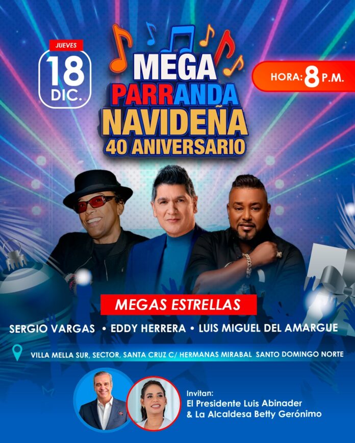 Santo Domingo.– La espectacular plataforma La Mega Parranda Navideña, que celebra 40 años ininterrumpidos llevando alegría, unión familiar y el mejor talento musical al pueblo dominicano, se ha consolidado como uno de los eventos culturales más trascendentales de la temporada navideña, impulsada por el presidente de la República, Luis Abinader Corona, con el propósito de fortalecer la convivencia social, la cultura y el espíritu festivo propio de la Navidad.