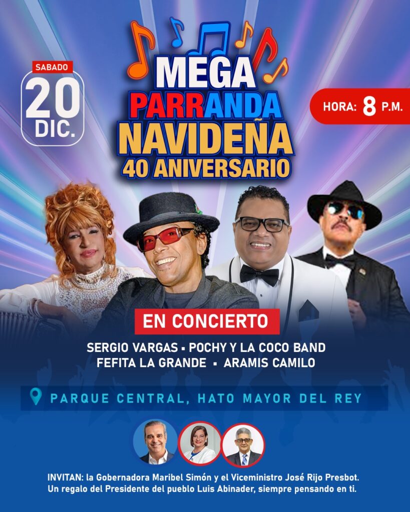 El sábado 20 de diciembre, desde las 8:00 p.m., La Mega Parranda Navideña llegará al parque Duarte de Hato Mayor, con las actuaciones de Sergio Vargas, Pochy Familia, Aramis Camilo y Fefita La Grande, con el apoyo de la gobernadora Maribel Simón y José Rijo Presbot.
