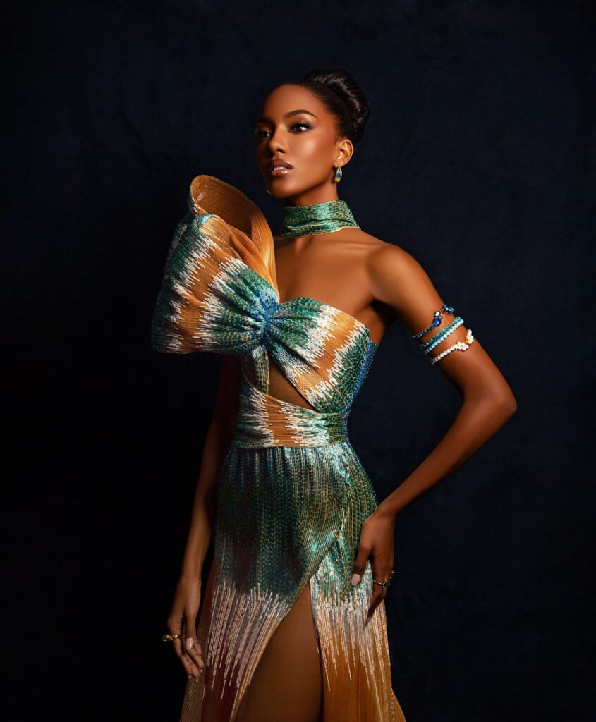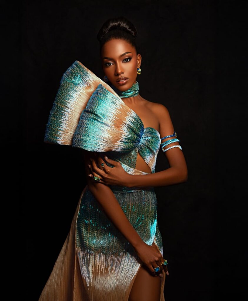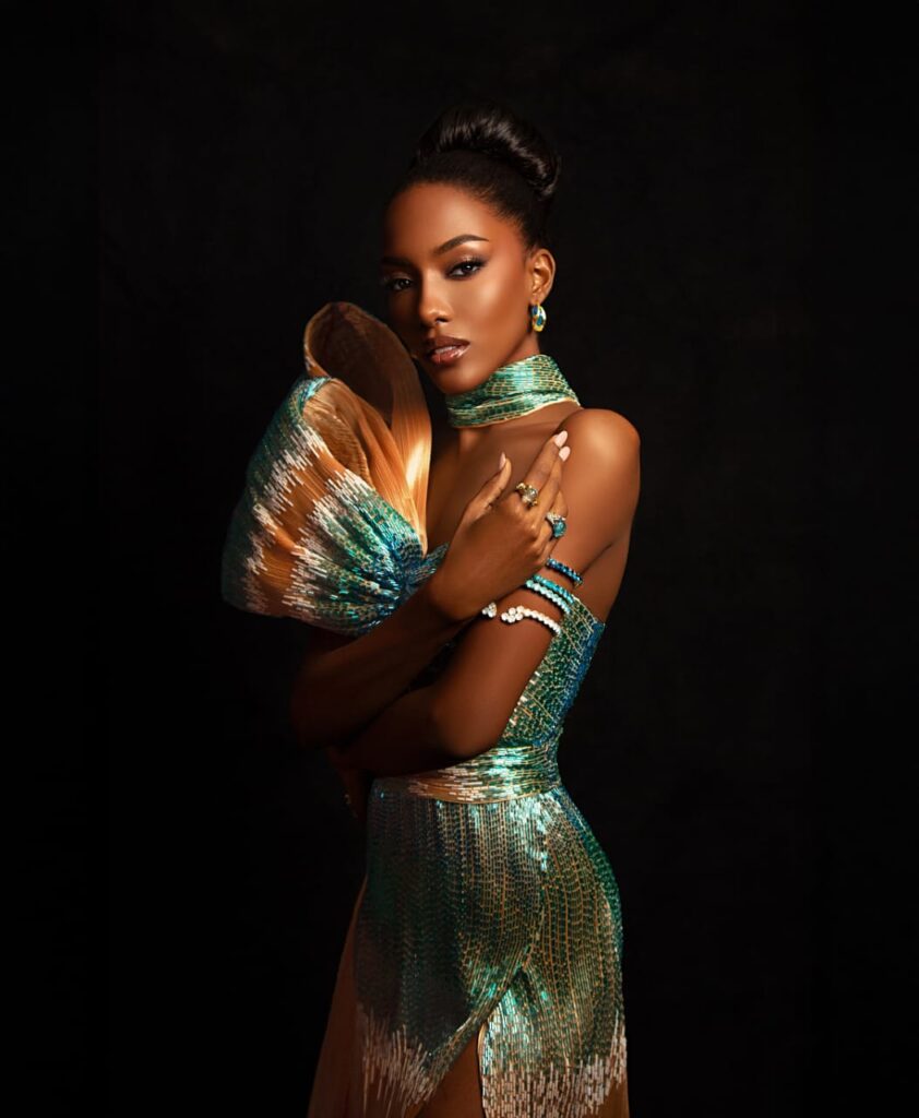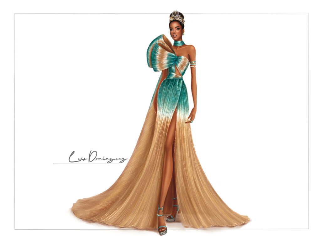“La Reina de los Mares” es el título que lleva la creación del diseñador dominicano LUIS DOMÍNGUEZ para la hermosa candidata al Miss Universo 2025 por las Islas Turcos y Caicos, BERENIECE DICKENSON.