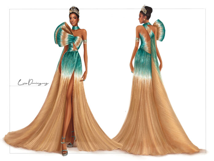 “La Reina de los Mares” es el título que lleva la creación del diseñador dominicano LUIS DOMÍNGUEZ para la hermosa candidata al Miss Universo 2025 por las Islas Turcos y Caicos, BERENIECE DICKENSON.