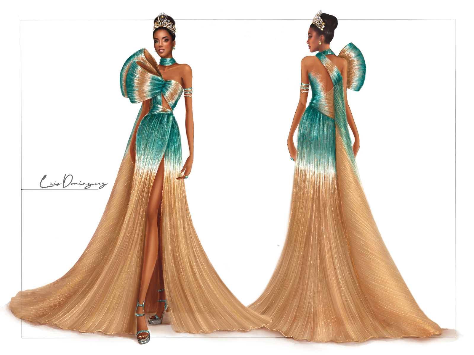“Este deslumbrante vestido está inspirado en las cristalinas aguas del mar y las playas más radiantes de las Islas Turcos y Caicos con sus hermosas tonalidades. Estas representan la fuerza y sutileza que posee la mujer, siendo únicamente comparadas con las implacables olas del mar, que a la vez nos transmiten paz y sofisticación a través de su movimiento”, detalló el diseñador.