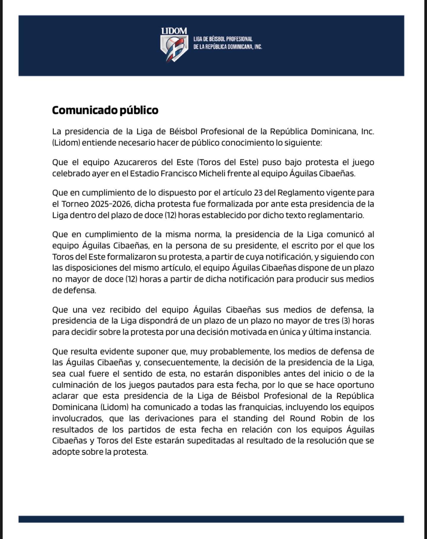 LIDOM formalizó la protesta de los Toros del Este y otorgó 12 horas a las Águilas Cibaeñas para presentar su defensa. Tras recibirla, la liga tendrá 3 horas para decidir.