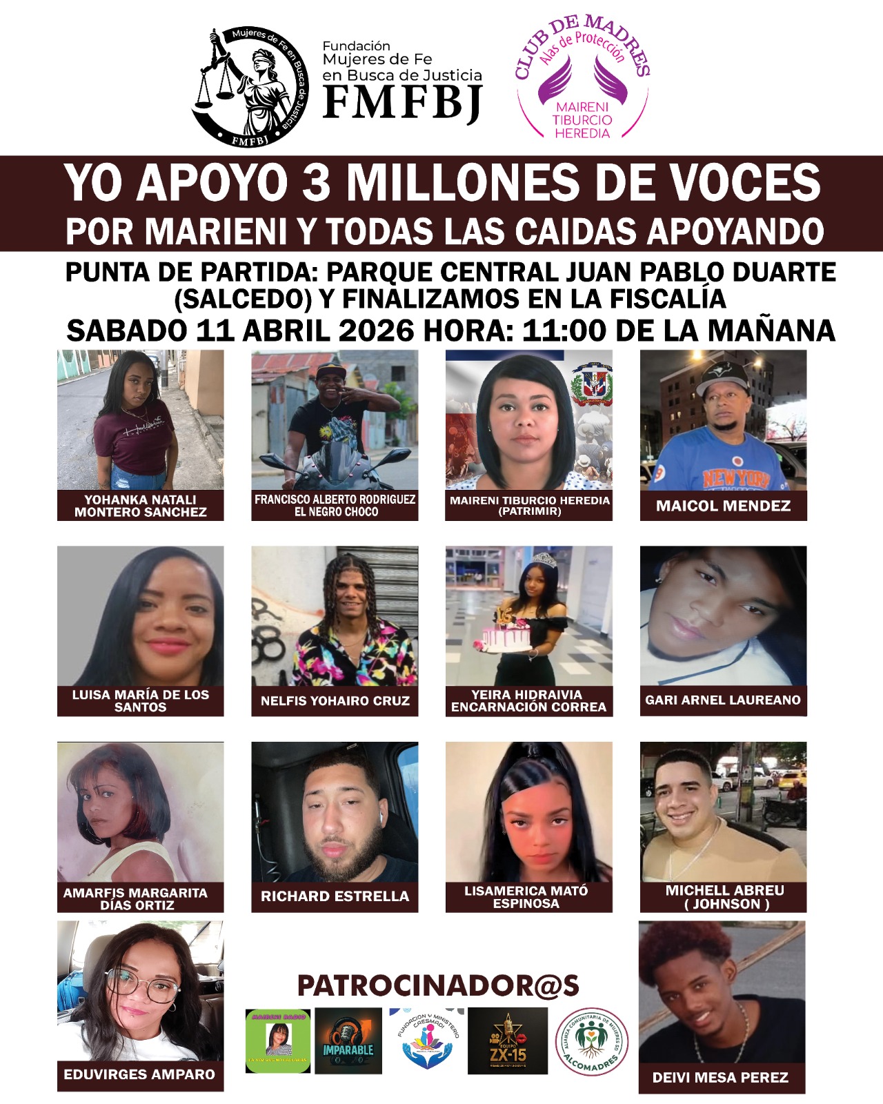 Salcedo, República Dominicana – Las organizaciones Madres de Fe en busca de Justicia y 3 Millones de Voces por Maireni y todas convocan a la ciudadanía a una caminata pacífica que se llevará a cabo este sábado 11 de abril de 2026, a las 11:00 de la mañana, en el municipio de Salcedo.