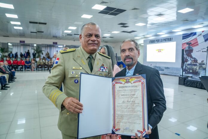 Santo Domingo. – En el marco del Mes de la Patria 2026, el Ministerio de Defensa de la República Dominicana, confirió la Medalla Reconocimiento al mérito en su primera clase oro distintivo azul ultramar, valor del patriotismo, al presidente de la Comisión Permanente de Efemérides Patrias, Juan Pablo Uribe.