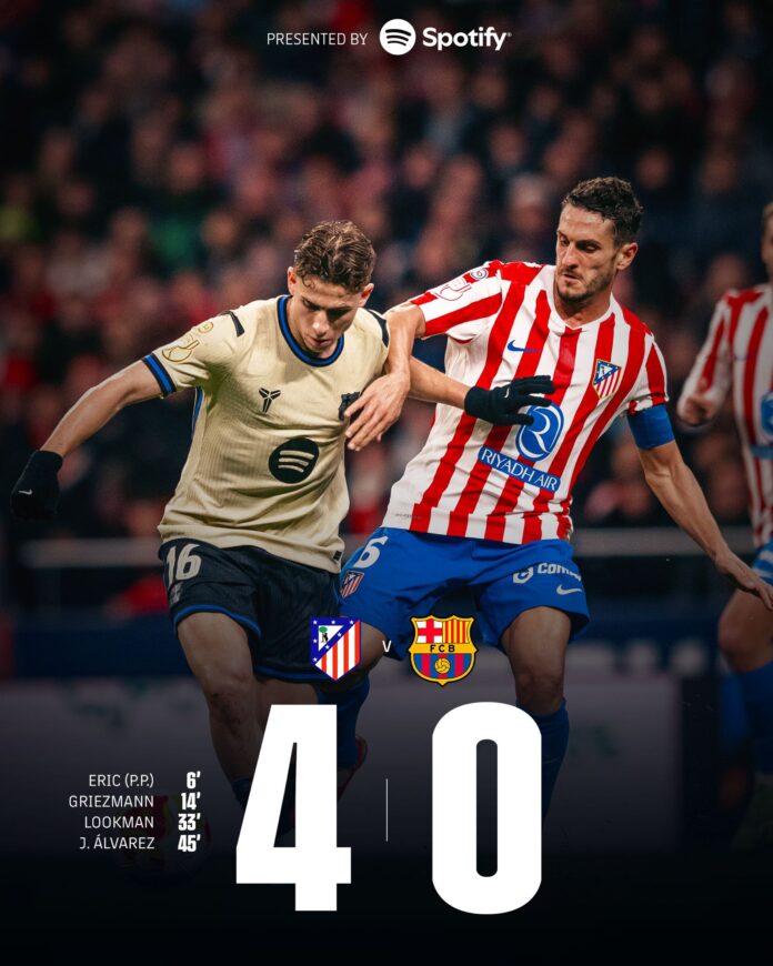 El Atlético de Madrid 𝗛𝗨𝗠𝗜𝗟𝗟𝗢́ 𝟰-𝟬 al Barcelona en las 𝗦𝗘𝗠𝗜𝗙𝗜𝗡𝗔𝗟𝗘𝗦 de IDA de la Copa del Rey, un 𝗣𝗔𝗥𝗧𝗜𝗗𝗢 totalmente 𝗔𝗧𝗜́𝗣𝗜𝗖𝗢 a lo que hemos visto de este Barcelona de Hansi Flick. El equipo blaugrana se lleva una 𝗠𝗨𝗬 𝗚𝗥𝗔𝗡𝗗𝗘 𝗗𝗘𝗦𝗩𝗘𝗡𝗧𝗔𝗝𝗔 para el partido de vuelta en el Camp Nou.
