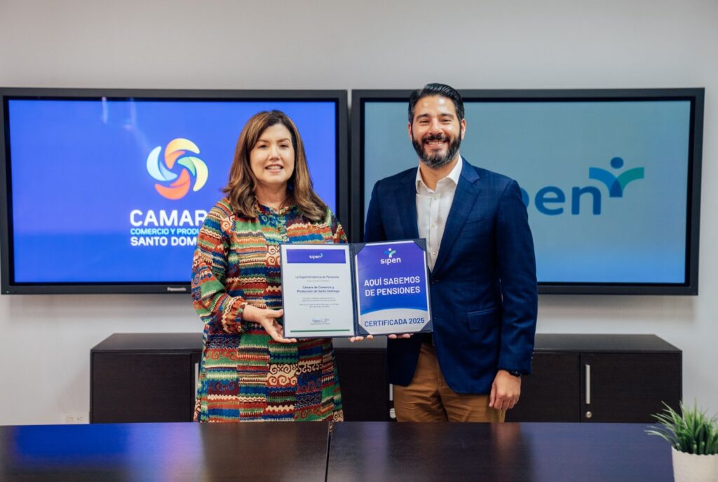 Santo Domingo, D. N- Con el objetivo de fortalecer la cultura previsional en el sector empresarial, la Superintendencia de Pensiones (SIPEN) entregó el sello “Aquí Sabemos de Pensiones” a la Cámara de Comercio y Producción de Santo Domingo, en reconocimiento a su compromiso con la formación previsional de su equipo humano.