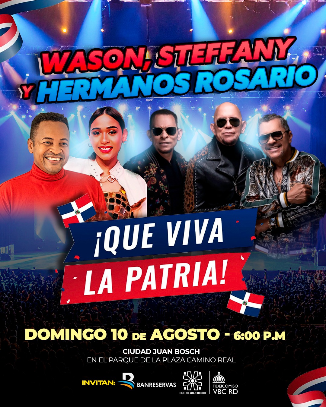 Este gran evento artístico reunirá en un mismo escenario a tres destacados exponentes de la música dominicana: Wason Brazobán, Los Hermanos Rosario y Steffany Constanza, quienes deleitarán al público con sus más populares éxitos en una noche cargada de patriotismo, música y celebración.
